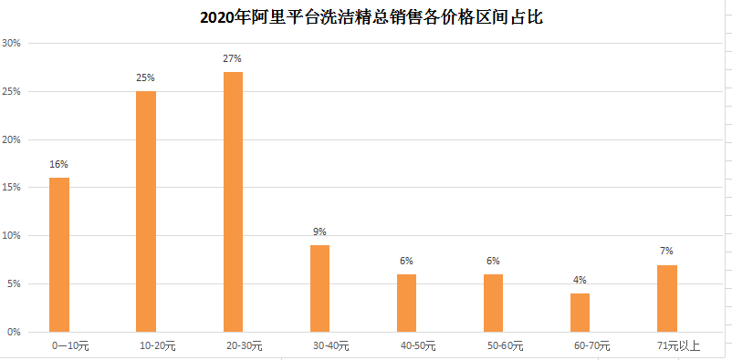 從數(shù)據(jù)可見(jiàn),2020年在阿里平臺(tái)洗潔精的總銷(xiāo)售額中,低價(jià)區(qū)間的產(chǎn)品占據(jù)了主要部分。其中,0到10元區(qū)間的貢獻(xiàn)了總銷(xiāo)售的16%,10到20元區(qū)間的貢獻(xiàn)了總銷(xiāo)售額的25%,20到30元區(qū)間的貢獻(xiàn)了總銷(xiāo)售額的27%,而30元以上各區(qū)間的洗潔精,總銷(xiāo)售額貢獻(xiàn)占比都在10%以下。