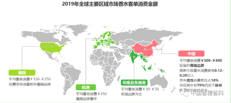 雖然我國香水消費者僅不到0.2億人,但購買能力十分可觀,客單消費金額在500-800元之間,遙遙領(lǐng)先于美國、歐洲、印度及東南亞地區(qū)。
