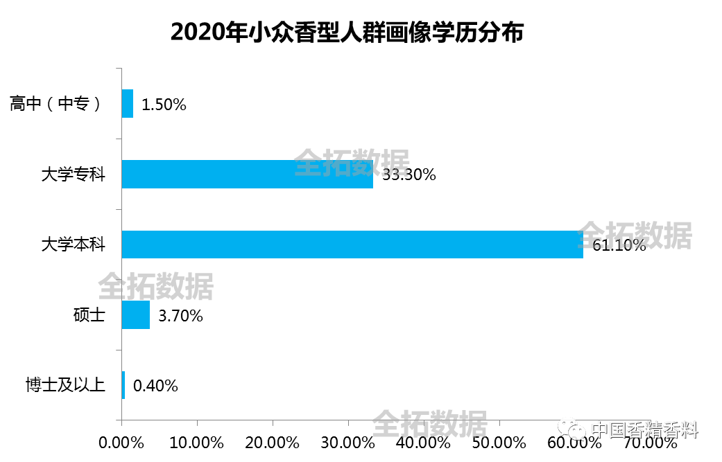 從小眾香型的人群畫像上可以看到,小眾香水消費(fèi)人群女性占比68%,男性占比32%,小眾香水用戶更為年輕,其中18-34歲占比76%,且主要集中在一二線城市,占比73%,個(gè)人月收入在5,000元以上,超七成婚姻狀態(tài)為未婚。小眾香水用戶經(jīng)濟(jì)能力和文化水平較高,高消費(fèi)占比53%,大學(xué)以上學(xué)歷占比61.1%。