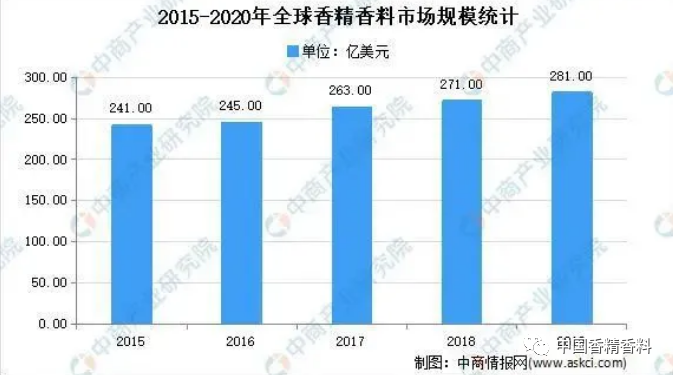 數(shù)據(jù)顯示,全球香精香料的市場規(guī)模從2015年的241億美元增長至2019年281億美元,復(fù)合年均增長率為5.1%。整體產(chǎn)業(yè)呈現(xiàn)向發(fā)展中國家市場轉(zhuǎn)移的趨勢,其中亞洲市場的增長速度最高。