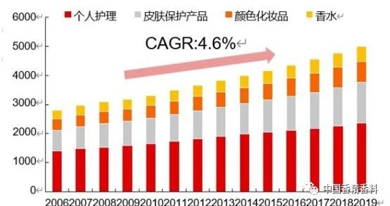 圖3 全球個(gè)人護(hù)理市場(chǎng)穩(wěn)定增長(zhǎng)(億美元)