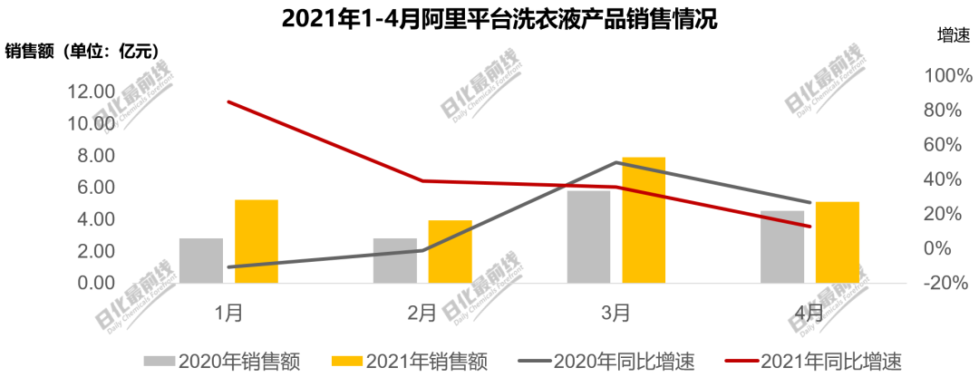 2021年1-4月阿里平臺洗衣液總體銷售額超過22億元,銷量超過4695萬件+,銷售額同比達(dá)38%;3月銷售額最高,超過7.9億元,同比增長超過35%;