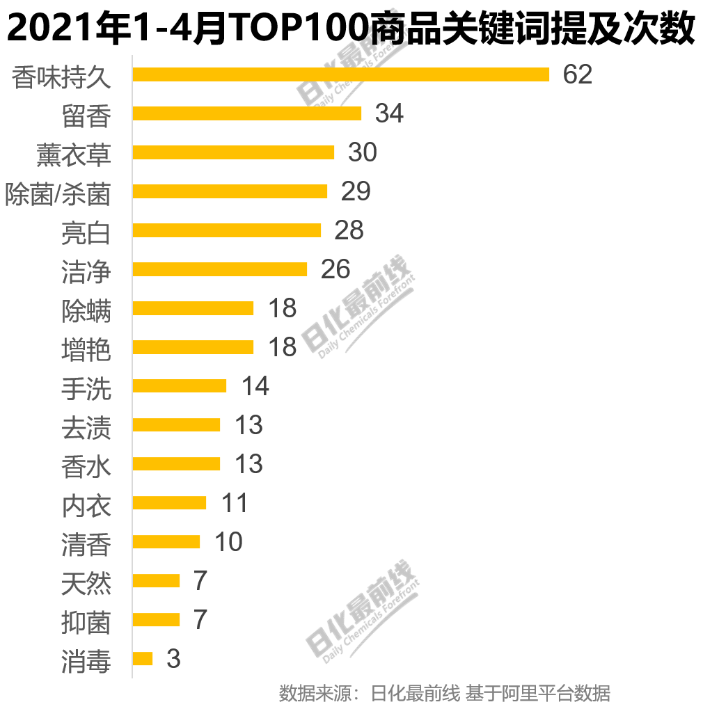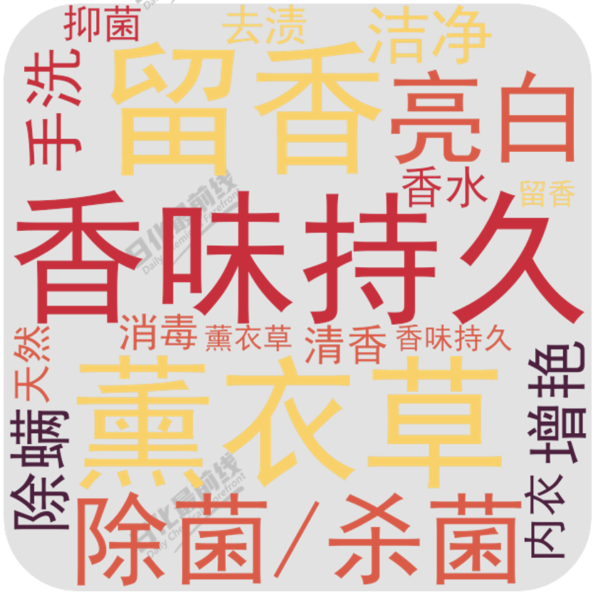 熱銷洗衣液產(chǎn)品大多強(qiáng)調(diào)其香味持久、抑菌殺菌的功效,另外薰衣草香味、亮白潔凈、除螨、增艷等效果也受歡迎。