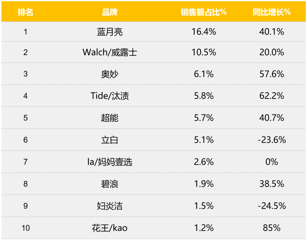 傳統(tǒng)洗衣液知名品牌藍(lán)月亮、威露士、奧妙、汰漬、超能占據(jù)頭部位置,占比超過44%;