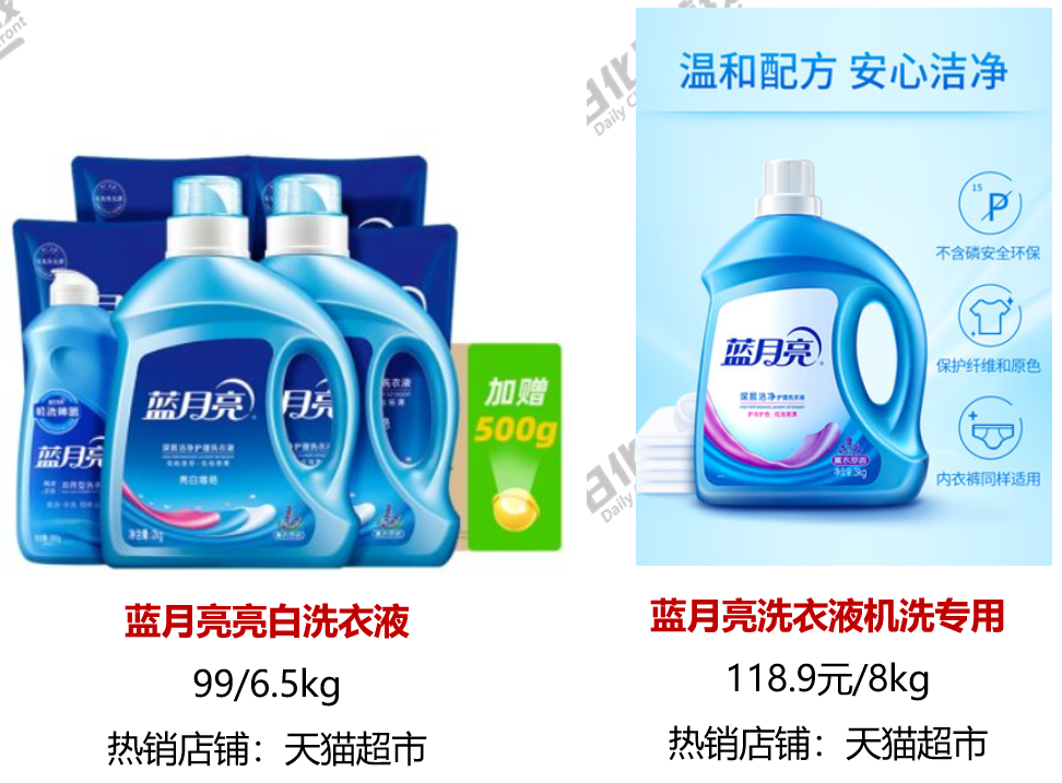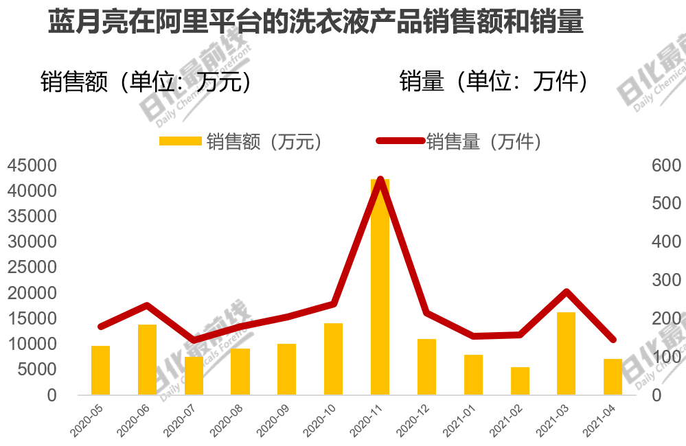 2021年1-4月阿里平臺藍(lán)月亮洗衣液液銷售額超過3億元,市場份額約為16.4%,銷量超727萬+件;主要熱銷產(chǎn)品為亮白洗衣液以及帶有機(jī)洗專用的洗衣液。