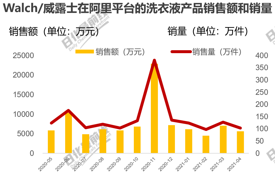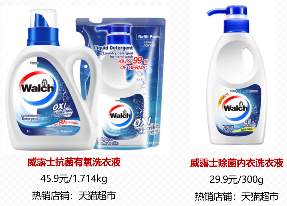 2021年1-4月阿里平臺Walch/威露士洗衣液產(chǎn)品銷售額超過2.3億元,市場份額約為10.5%,銷量超450萬件;主要熱銷產(chǎn)品為威露士除菌洗衣液以及除菌內(nèi)衣洗衣液。