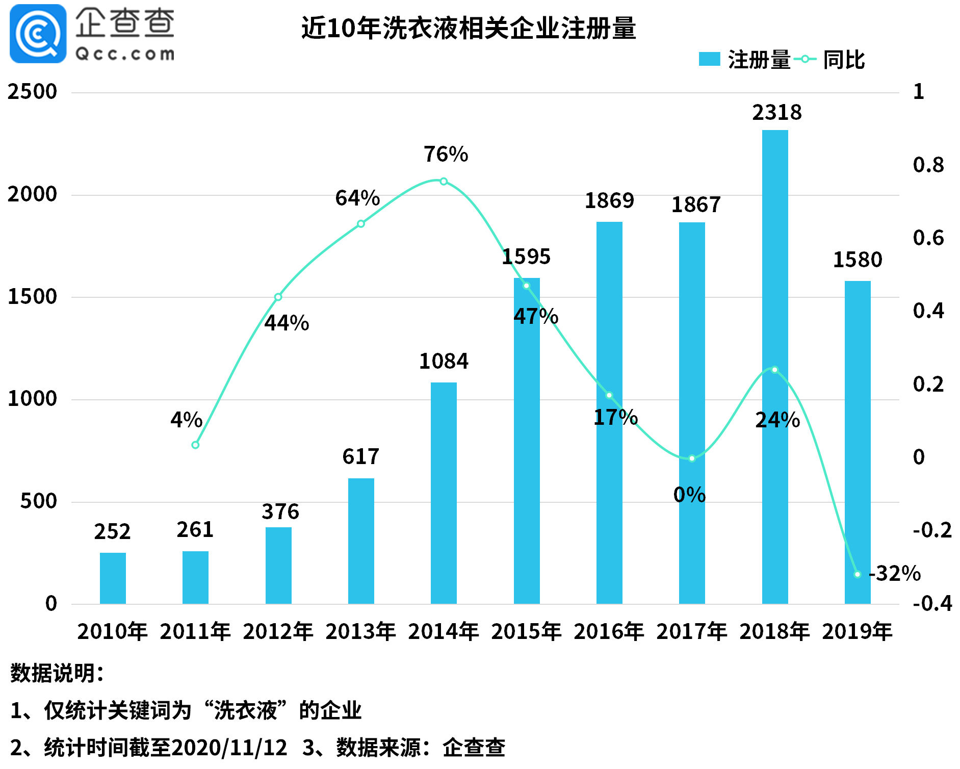 企查查數(shù)據(jù)顯示,2010-2018年我國洗衣液相關(guān)企業(yè)注冊量總體呈現(xiàn)增長趨勢,2010-2013年均注冊量為377家,2014年增長率是近10年來最高的,同比增長76%,注冊量達(dá)1084家。2018年注冊量是近10年來最高的,共新增2318家,同比增長24%。2019年稍有下降,新增1580家,同比下降32%。