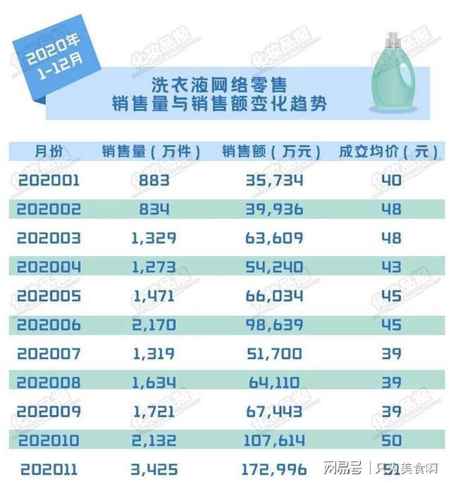 維恩咨詢數(shù)據(jù)顯示,2020年全年,國內(nèi)洗衣液線上(包括天貓、京東、聚美、國美、當當、蘇寧、亞馬遜、唯品會平臺)總銷售額為88.6億元,同比2019年增長19%,銷量1.98億件,成交均價45元,高于2020年全網(wǎng)線上彩妝成交均價43.9元(歐特歐數(shù)據(jù))。