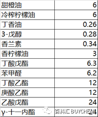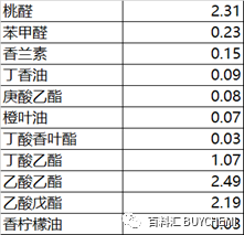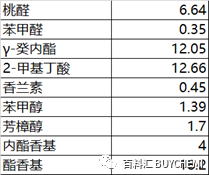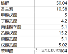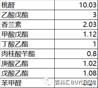 (4)進(jìn)一步改善的桃子香精代表配方為,由γ-十一內(nèi)酯、乙酸戊酯、丁酸戊酯、甲酸戊酯、己酸乙酯、戊酸乙酯、香草醛、苦杏仁精油、肉桂精油、香葉精油、苦橙精油、纈草精油以及少量的γ-壬內(nèi)酯組成。