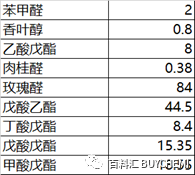 (3)介于上面兩種配方之間,由γ-十一內(nèi)酯、乙酸戊酯、丁酸戊酯、戊酸戊酯、乙酸乙酯、辛酸乙酯、肉桂酸乙酯、庚酸乙酯、苯乙酸乙酯、乙基香草醛以及斯里蘭卡肉桂精油、鼠尾草精油、檸檬精油、多香果精油以及甜橙精油組成。