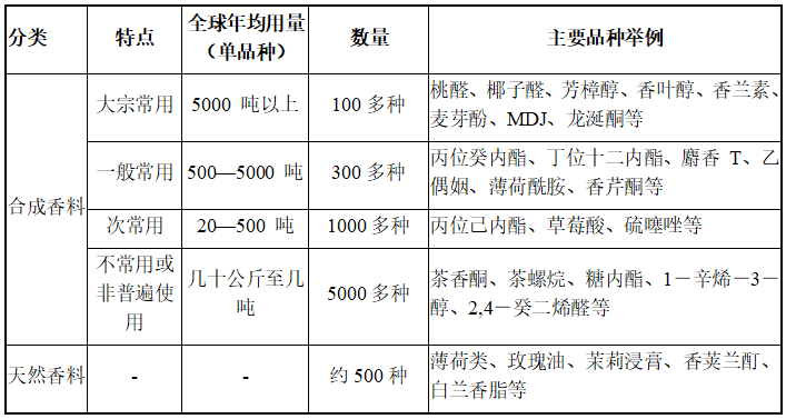 目前,世界上香料品種約7000種,數(shù)量眾多,其中合成香料約6000多種、天然香料(國(guó)際市場(chǎng)有名錄的)約500種。根據(jù)下游的用量及用途的不同,不同香料品種的市場(chǎng)需求量從幾十公斤至上萬(wàn)噸不等,差異較大,基本情況如下: