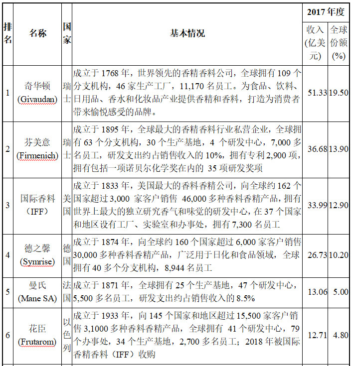 全球香精香料產(chǎn)業(yè)呈現(xiàn)高度壟斷格局,國(guó)際十大香精香料公司多集中于發(fā)達(dá)國(guó)家,代表企業(yè)有瑞士的奇華頓和芬美意、美國(guó)的國(guó)際香料香精和森馨、德國(guó)的德之馨、法國(guó)的曼氏和羅伯特,以及日本的高砂和長(zhǎng)谷川等。在20世紀(jì)80年代,發(fā)達(dá)國(guó)家香料香精企業(yè)仍處于高度分散狀態(tài),自90年代以來(lái),行業(yè)集中程度明顯加速,核心生產(chǎn)企業(yè)市場(chǎng)地位日趨穩(wěn)固,2017年前十大生產(chǎn)企業(yè)市占率達(dá)78.73%,頭部公司奇華頓的全球市場(chǎng)份額就高達(dá)20%。隨著2018年國(guó)際香料香精完成對(duì)花臣的收購(gòu),行業(yè)市場(chǎng)集中度更趨明顯。