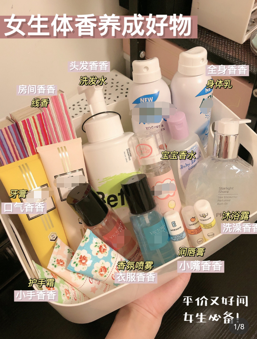 腌肉體必備物品,則早已從最基礎(chǔ)的香水、香膏,衍生到了一切往身上抹的日用品: